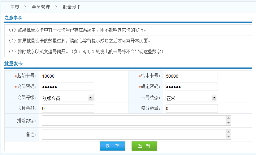 操作流程: 按規(guī)則填寫參數(shù)------>點擊保存------>批量發(fā)卡成功