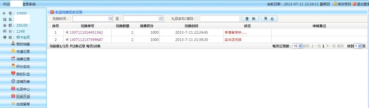 消費(fèi)記錄: 1.查詢(xún):可以根據(jù)兌換單號(hào) 時(shí)間段 等條件查詢(xún) 2.導(dǎo)出:可以將按條件查詢(xún)出來(lái)的數(shù)據(jù),以Excel表格形式導(dǎo)出 3.列表:雙擊兌換單號(hào),可以查看消費(fèi)詳情 (見(jiàn)下圖)