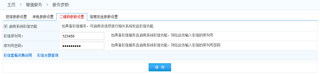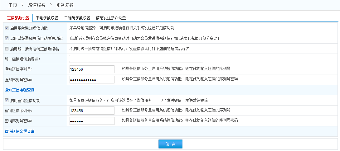 注意: 1.每一個參數(shù)對應著系統(tǒng)的一個功能,請務必閱讀完每條參數(shù)后面的說明文字后 再開啟或關(guān)閉該功能。 2.通知短信是會員在本系統(tǒng)中進行消費充值等操作時給會員發(fā)的提醒短信;營銷短信是為了促銷等目的專門為一個或多個會員發(fā)送的(營銷短信有且只能在發(fā)送短信的頁面發(fā)送)